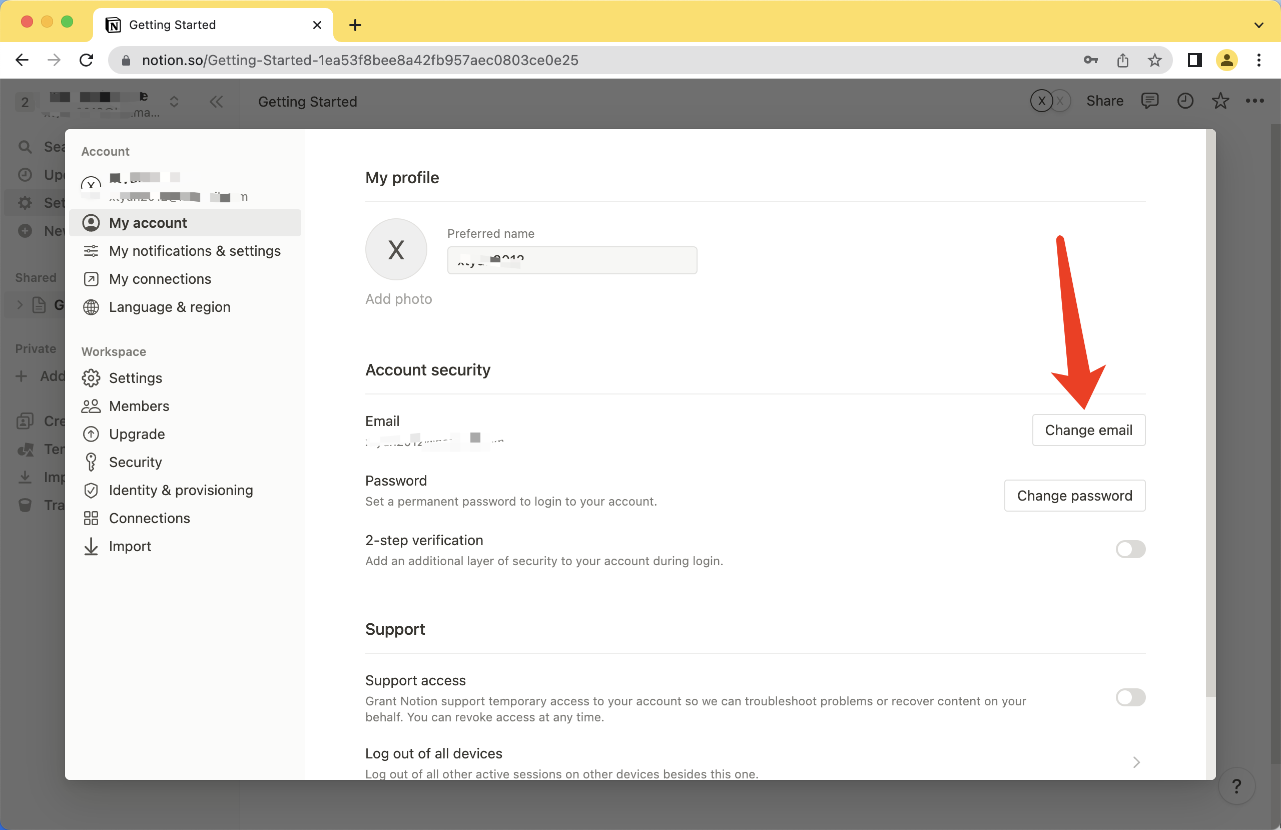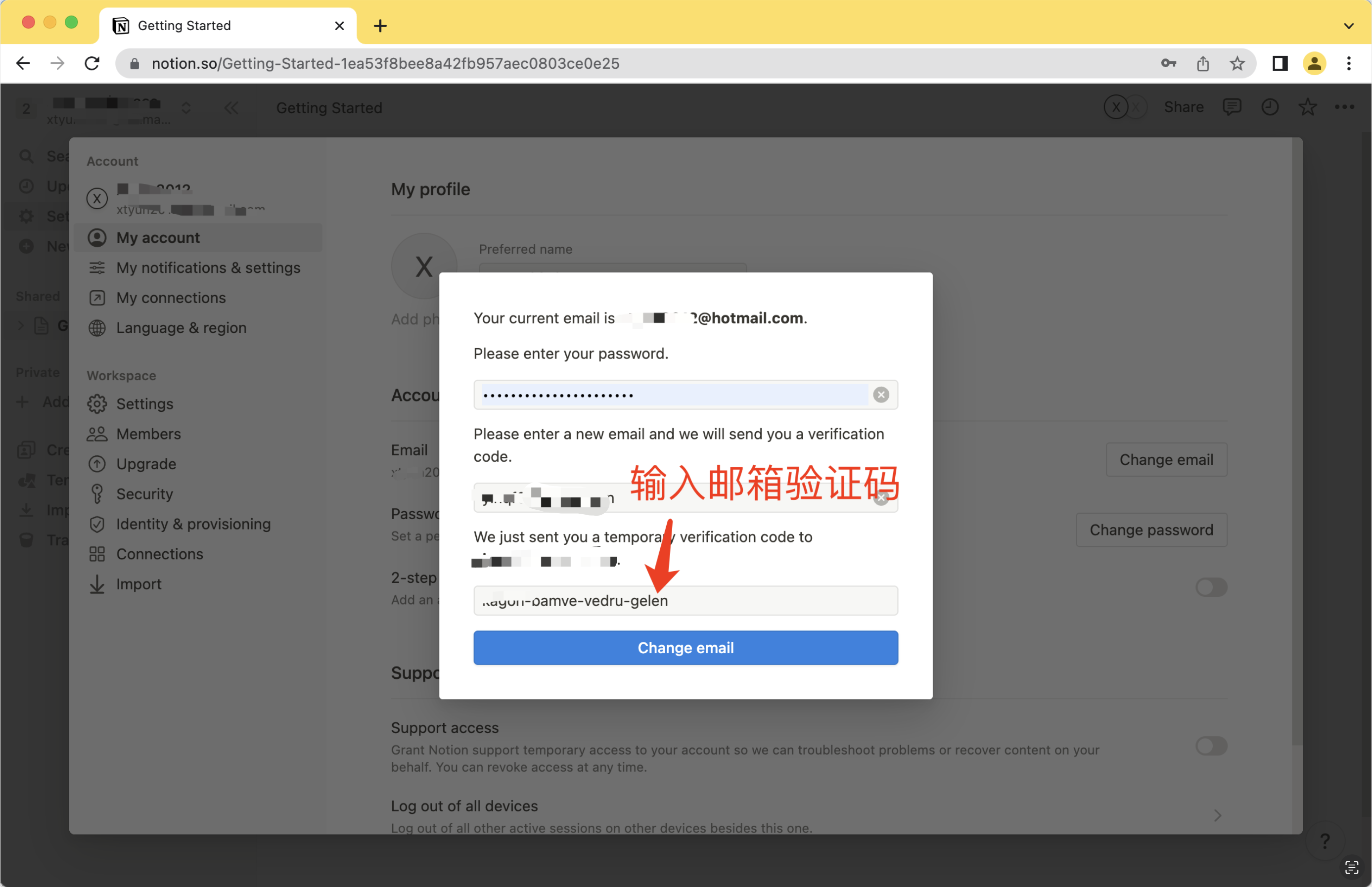 点击左侧的账户(account),并且在右侧点击修改邮箱(change email),修改邮箱为notion认证的邮箱。