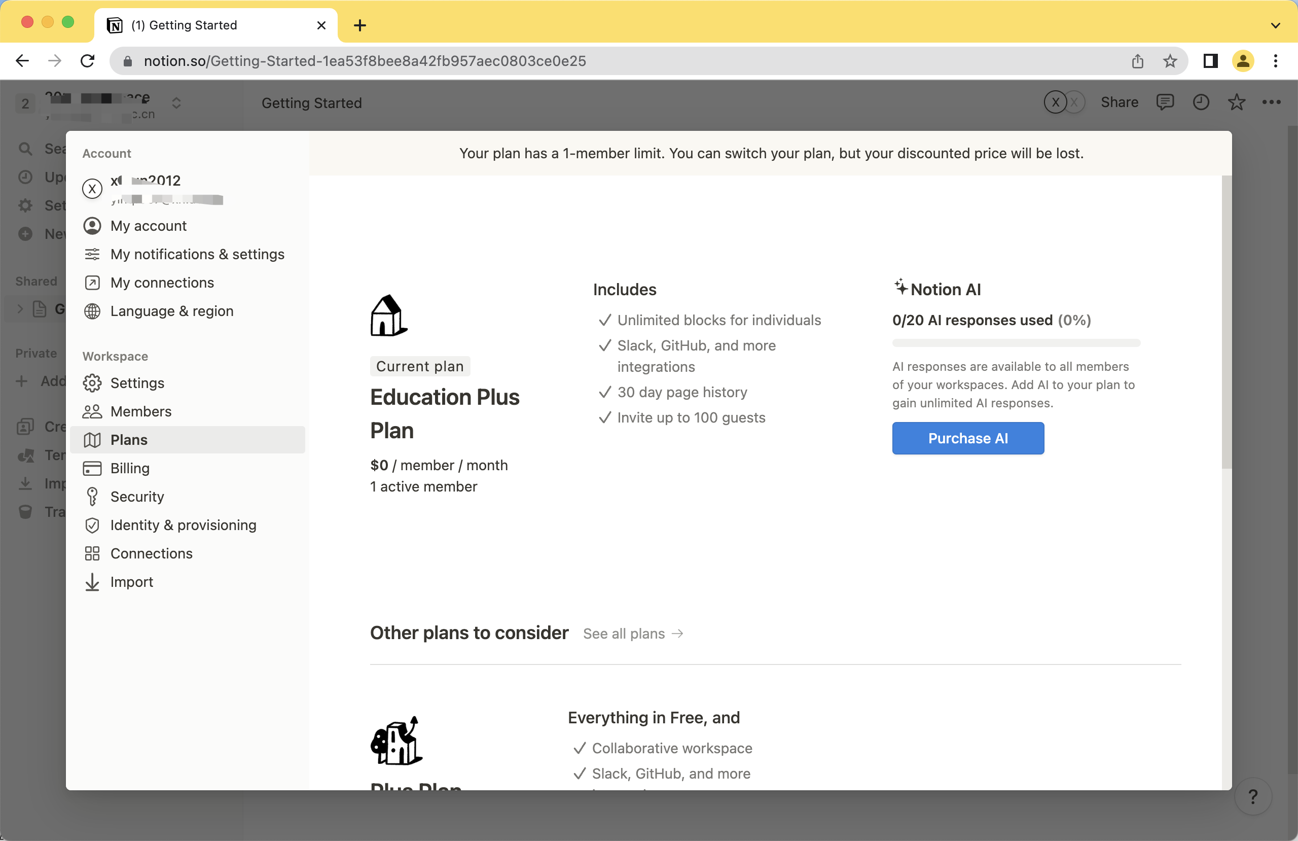 回到notion首页,点击settings & members -> Plans或者Upgrade,点击Get the Education Plan,即可完成激活认证。