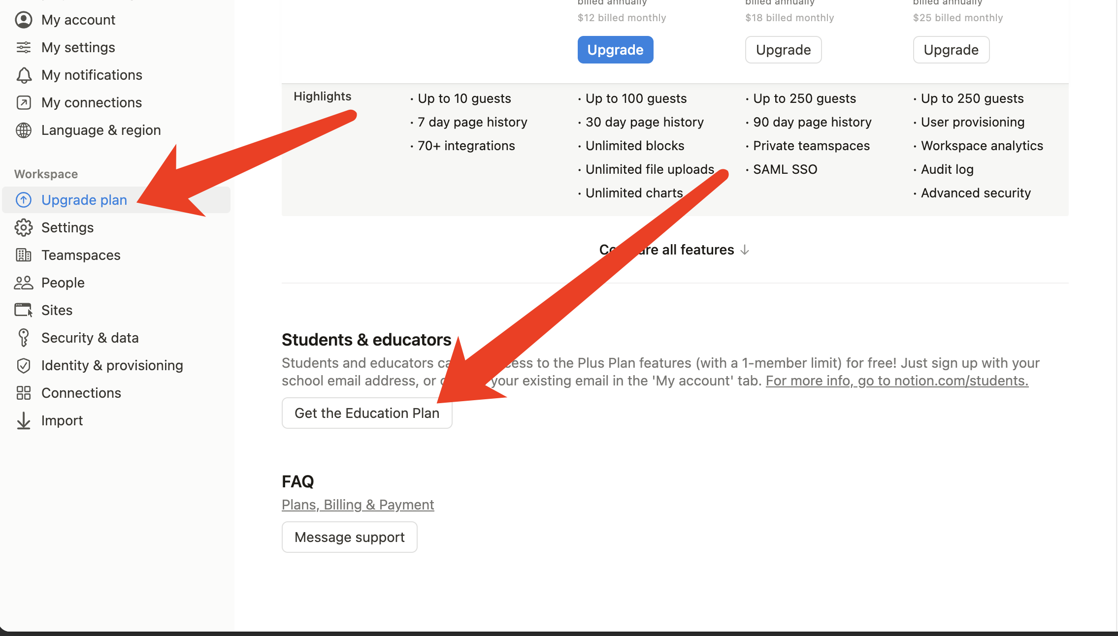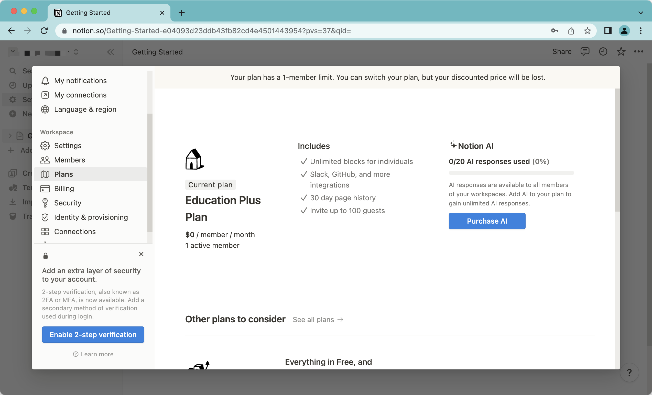 点击settings & members -> Plans或者Upgrade,查看是否已经激活。若显示为Education Plus Plan,则表示已经激活成功。